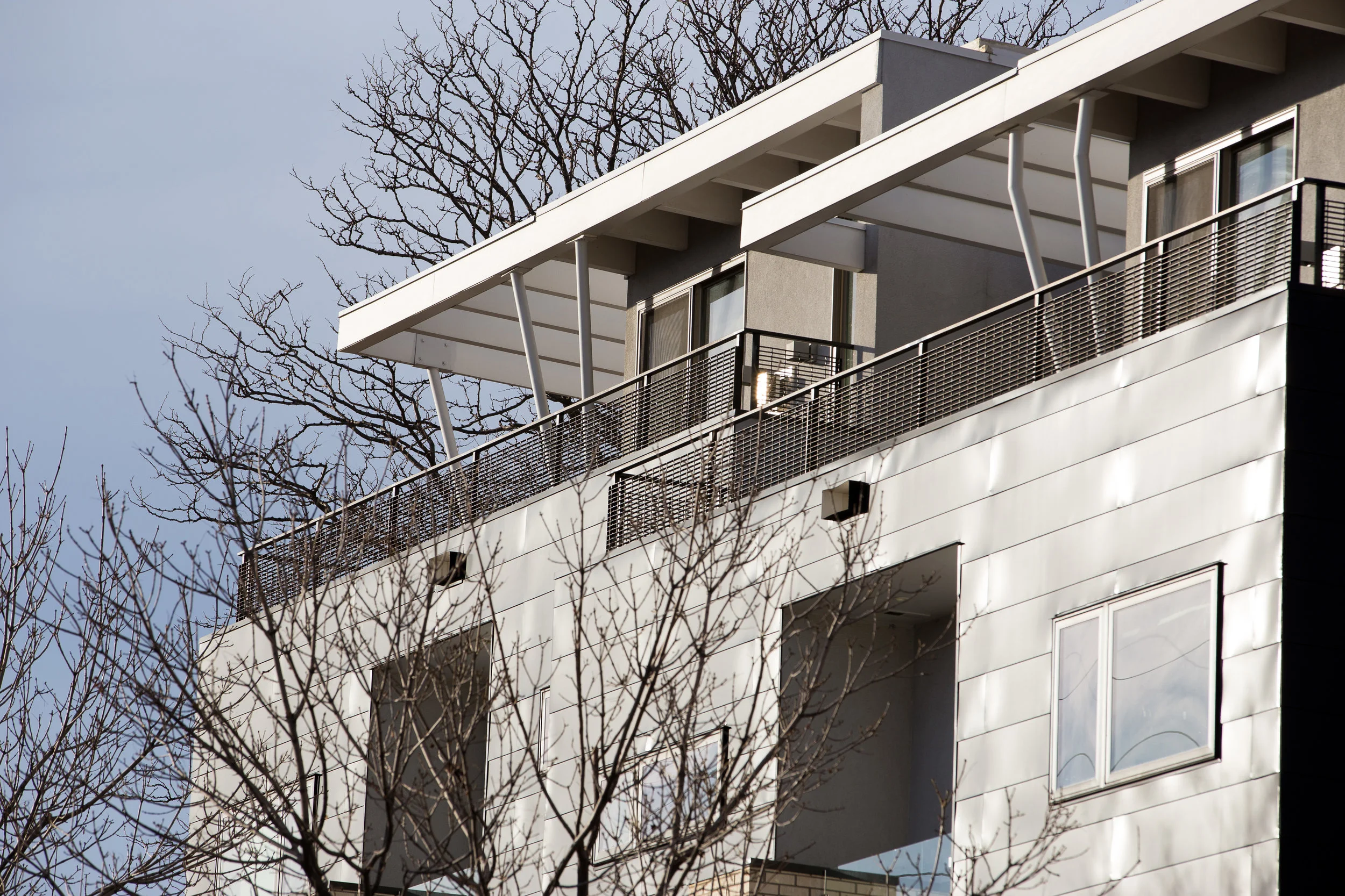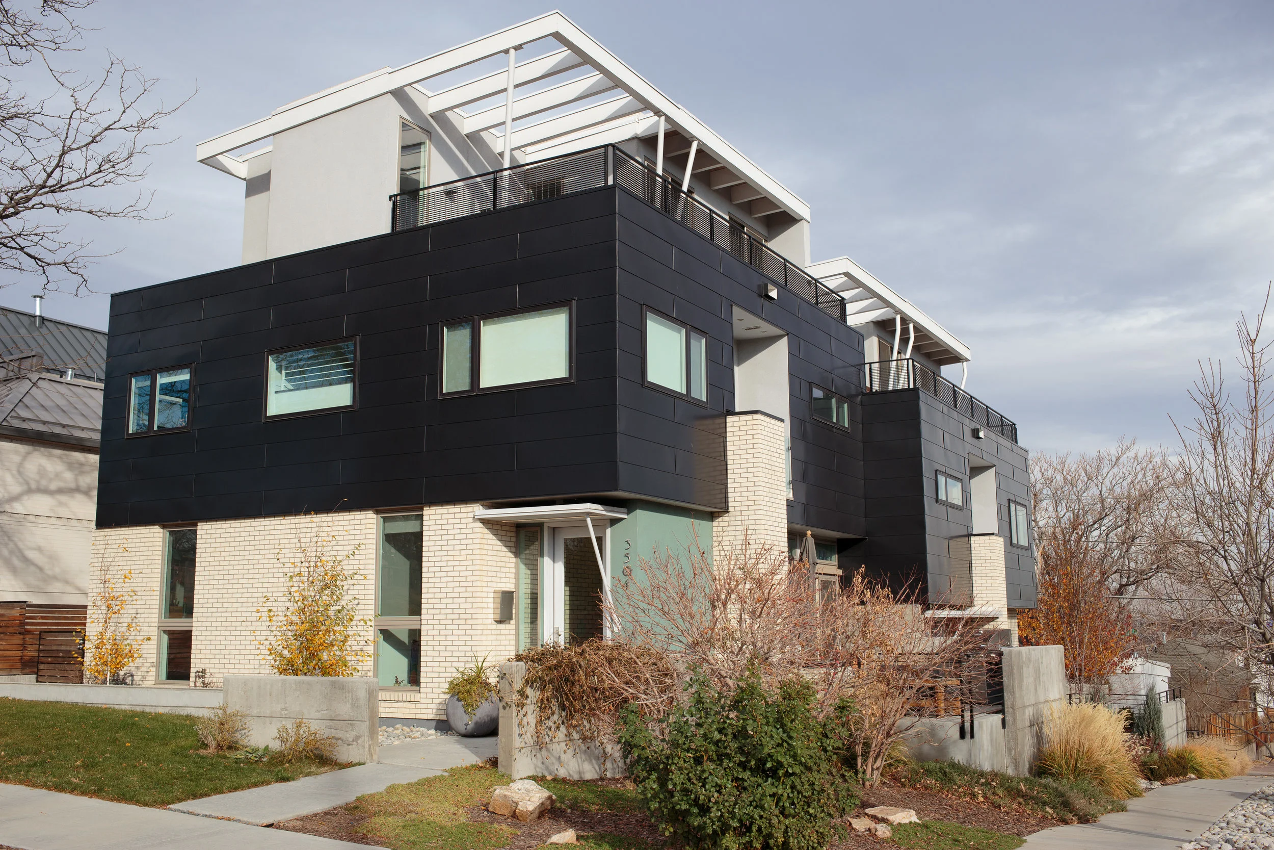 The off-white brick base that the houses rest on is found on bungalows throughout the neighborhood. While the lowest level of the houses nod to the past, the upper levels utilize metal panels and other contemporary materials to clad the exterior of the homes.